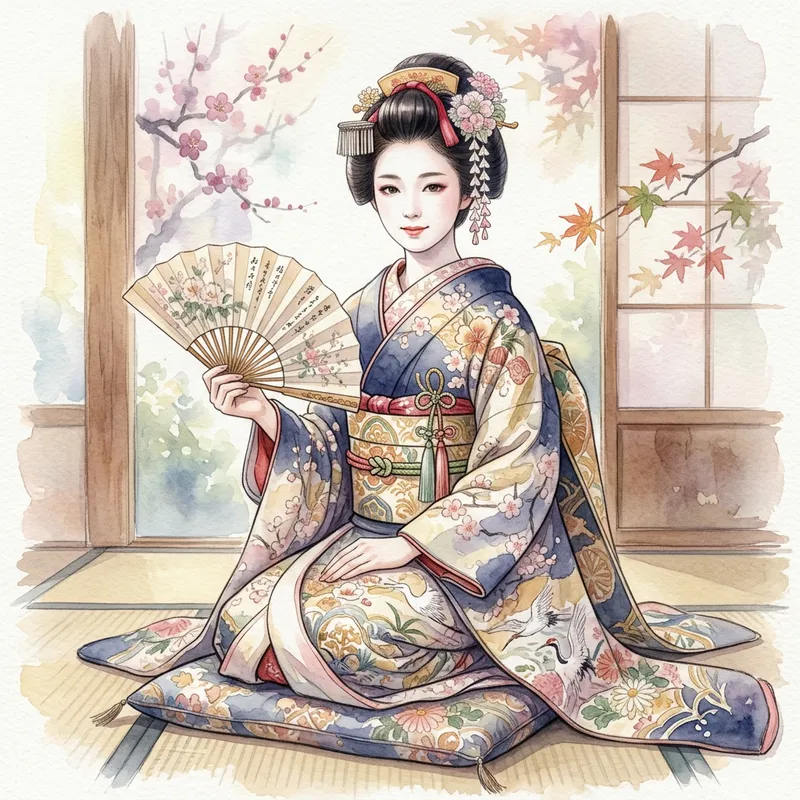elegant geisha in traditional kimono, painted in soft watercolor hues with delicate brushstrokes, serene facial expression, holding an ornate fan, fine art digital painting, cultural artistry.