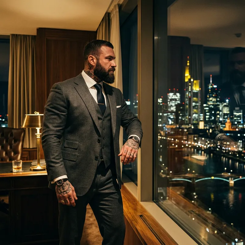 An elegantly dressed German executive of imposing physique and a well-groomed beard overlooks the stunning nighttime skyline of Germany from his high-rise office. This sophisticated individual possesses stylish tattoos, adding a touch of modernity to his traditional attire. Bathed in warm, golden hues reminiscent of film noir, the room casts dramatic shadows that emphasize his commanding presence. The shot, suggestive of a high fashion editorial, adds an extra touch of elegance through the flawless tailoring of his suit. Every detail is captured exquisitely through the lens of a high-end medium format camera, revealing not only his outward refinement but also his symbolic power as a businessman.