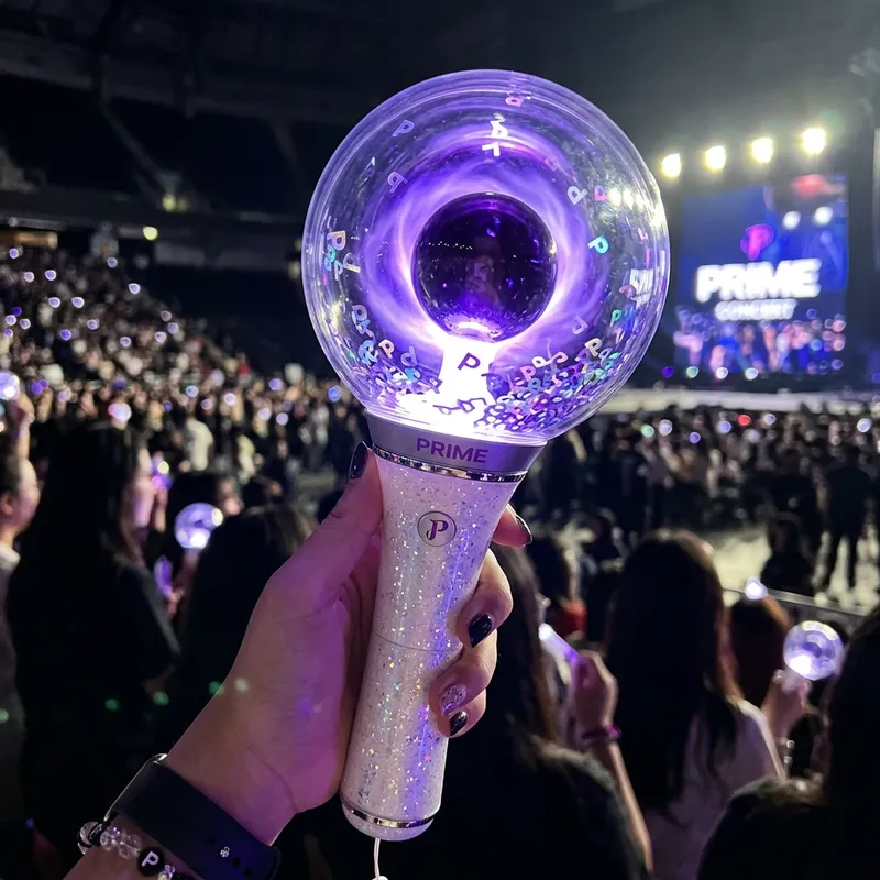 A Kpop lightstick with a glittering white handle that exudes a sense of elegance and charm. The upper part of the lightstick features a transparent sphere, within which is a smaller sphere. When illuminated, this smaller sphere casts a purple-black aura all around. The larger sphere also contains freely floating p-lettered glitters, which swirl and dance around the smaller sphere, adding an extra dimension of sparkle and magnificence to the design.