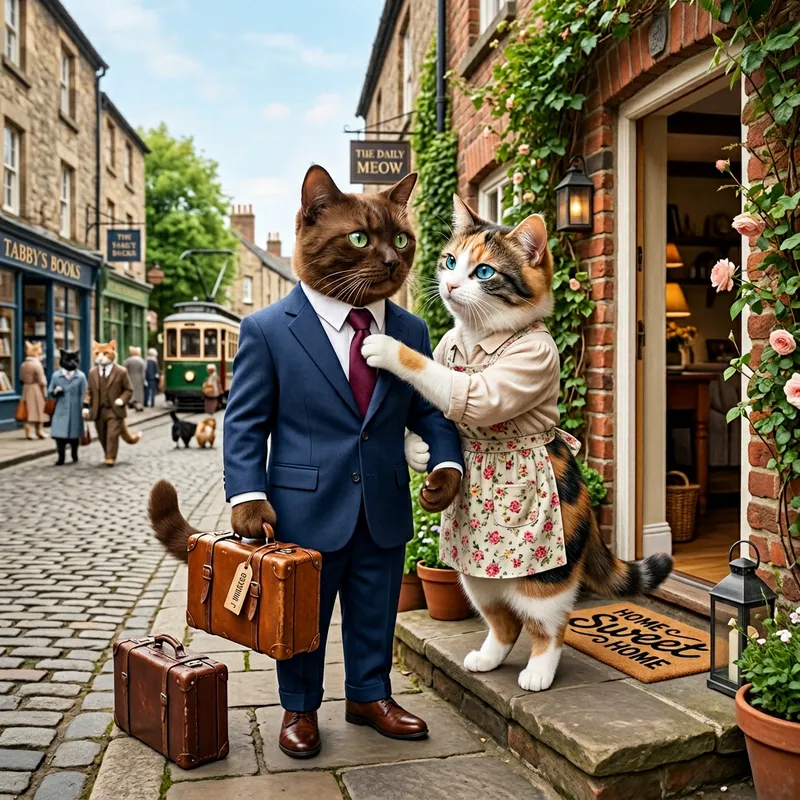 A brown-furred male cat with striking green eyes, dressed elegantly, has embarked on his journey to work, holding a suitcase carefully in his paw. Simultaneously, a graceful female cat with her enchanting blue eyes, matching the beauty of a pristine lake, assists him by adjusting his tie and offering emotional support. The scene captures the essence of their deep affection, the nuances of domestic life, and the excitement of the outside world.