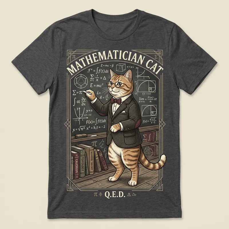 An elegant t-shirt design featuring a mathematician cat in a sleek and stylish manner. The feline creature is anthropomorphized, standing on its hind legs, and is dressed in formal attire. It holds a piece of chalk in its paw, writing complex mathematical equations onto a large chalkboard. The ambiance is scholarly and intellectual, but still fitting for a casual shirt design. Extra details could include geometric patterns or mathematical symbols woven subtly into the overall design, in a harmonious fusion of academia and fashion.