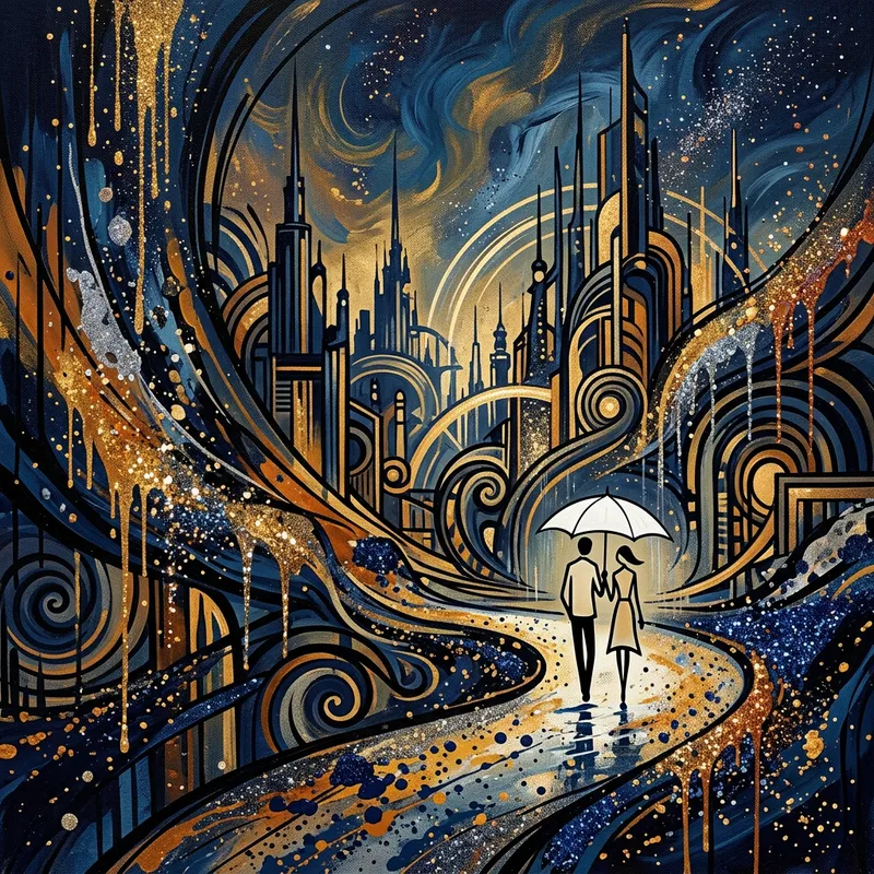 Depict a visual symphony of elegant and modern abstract art with two minimalist figures under a white umbrella appearing from a marvelous retro-futuristic world. The overall color scheme should consist of opulent gothic tones of dark amber and navy, and should be contrasted by bold black lines. Add elements of glitter drips and splatters which lend a stylish and contemporary touch to the artwork. The exquisite texture and movement should captivate the viewer and immerse them in this world of artistic allure. The work of art should be in 8K resolution to suggest the detail of this digital masterpiece.