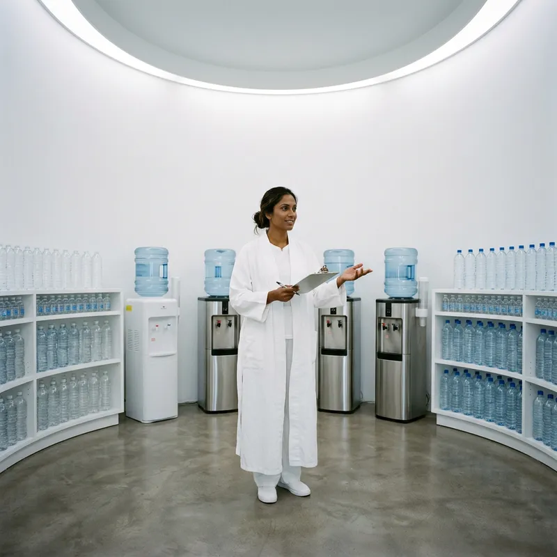 A spherical room painted entirely in white, the area is adorned with a semicircle arrangement of water coolers. Shelves lining the edges of the room are laden with water bottles arranged systematically. Standing in the middle of this room is a South Asian woman donned in a pristine white robe, seeming to be in charge of the place.