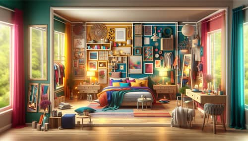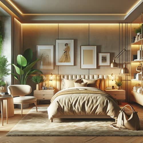 A double bedroom radiating elegance with its bright and vibrant colors, cultivating an energetically welcoming atmosphere. The room enhances this vivaciousness with strategically placed mirrors that highlight the vitality in the space. Its design combines added texture and sophistication derived from velvet materials placed throughout the room. Elegant lamps sitting on tables emit a cool light, augmenting a chic contemporary aura. The elements such as mirrors, velvet materials, and lamps, harmoniously to create a stylish and alluring space. This scene is to be captured using a simulated effect of a wide-angle lens akin to a Canon EOS R5's 24mm f/2.8 lens, contributing to a complete understanding of the overall design. The medium should be akin to a digital painting executed with soft brush strokes, reminiscent of interior design photography.