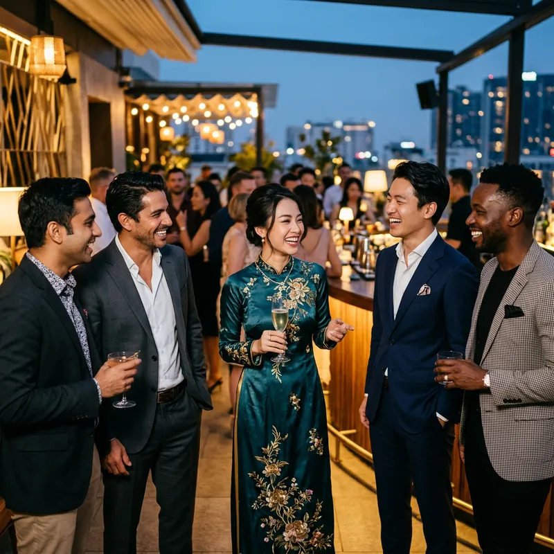 An elegant woman of Vietnamese descent is surrounded by handsome men of various descents. She is dressed in a stunning ensemble that makes her stand out in the crowd. The men are well-dressed too, showcasing their unique style and charm. They are all engaged in a vibrant social gathering, chatting and laughing together in a well-decorated, lively atmosphere.
