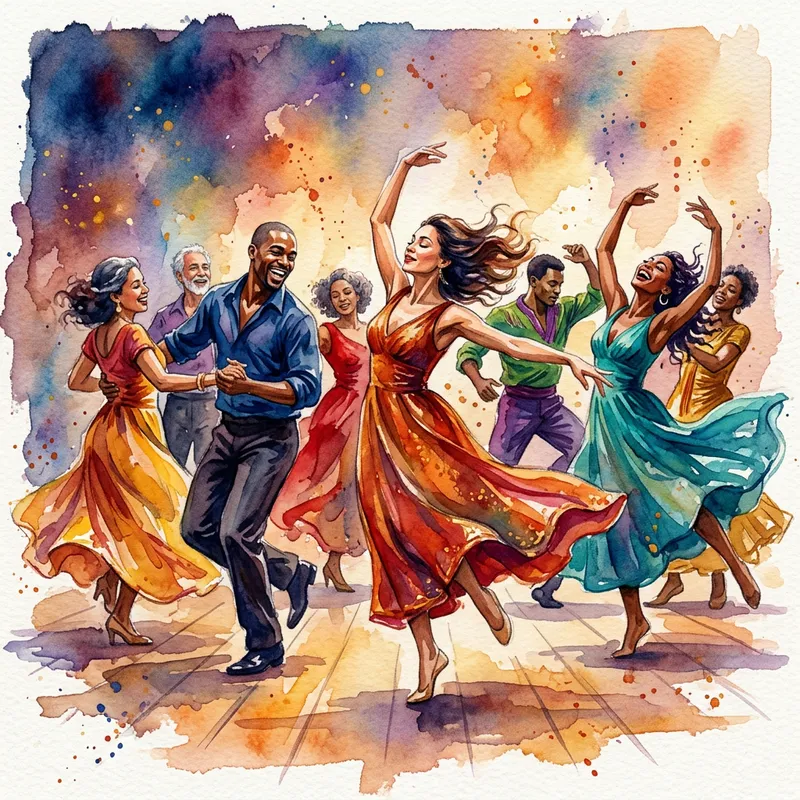 An elegant watercolor painting depicting a diverse group of individuals engaging in the art of dance. The painting captures the fluidity and rhythm of their movements, the vibrant colors of their outfits, and the intensity of emotion on their faces. The background is an atmospheric mixture of hues that perfectly enhance the dancers' performance.
