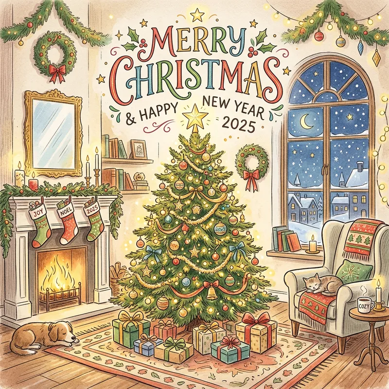 Please create a colorful and festive illustration symbolizing a Merry Christmas and Happy New Year. The setting should embody the style of a hand-drawn sketch with light strokes. The main element should be an elegantly decorated Christmas tree, brimming with twinkling lights and refined ornaments.