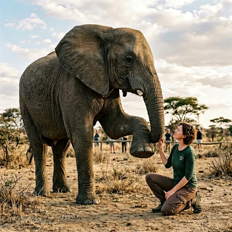 A large elephant interacting gently with a person, the elephant lifts its leg as if to step but instead hovers over the person without causing any harm.
