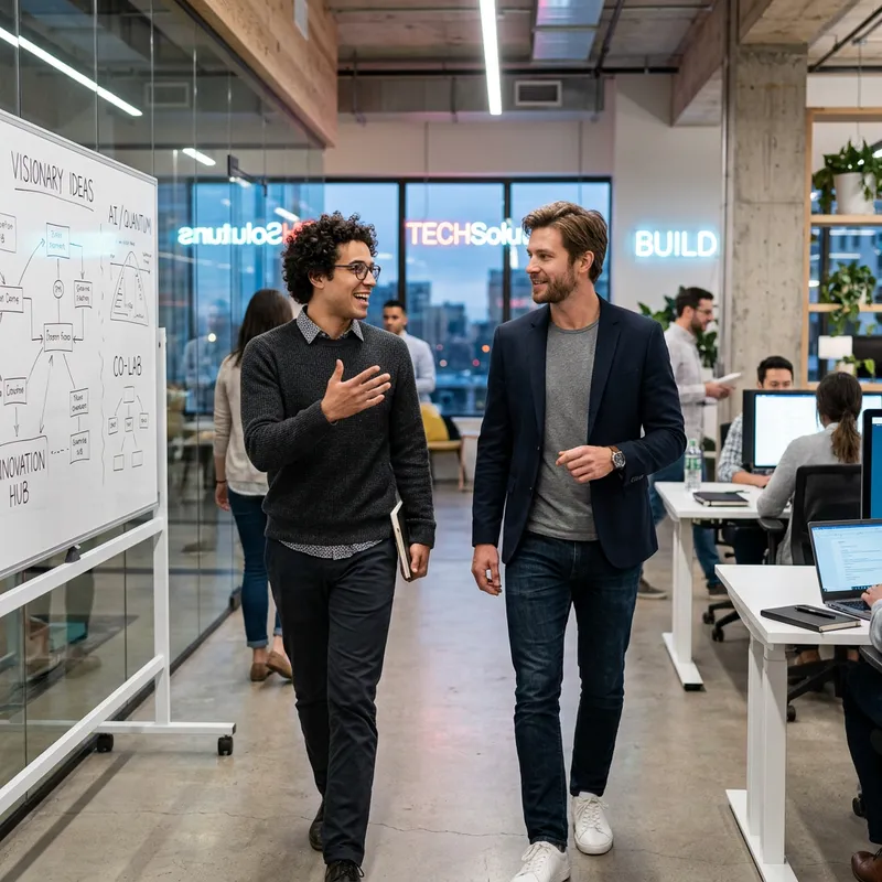 An image of two innovative tech entrepreneurs. The first one is a man with a fit physique, light brown hair and a casual style of dress; he has a determined look on his face. Standing next to him, there's another man who is slightly younger, has curly dark hair and glasses, and he exudes intellectual energy as he chats enthusiastically with his peer. They are engaged in a friendly conversation, full of visionary ideas, and around them a backdrop of a high-tech office environment is depicted.
