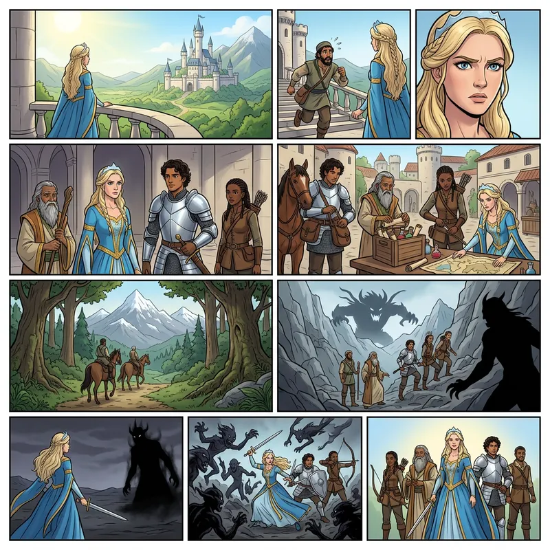 Panel 1: Illustrate a Caucasian Princess named Manorah standing in front of a majestic castle in the kingdom of Elysium, gazing at her land. Panel 2: Picture a nervous messenger, a middle-eastern man, rushing to Princess Manorah, conveying urgent news of a looming peril. Panel 3: Show Manorah's face focused and intent as she absorbs the grave news. Panel 4: Brandon, a brave Hispanic knight, an elderly sage of South Asian descent, and a black female archer join Manorah as her loyal companions. Panel 5: The group, actively assembling their weapons and gathering supplies, begins preparation for their adventurous journey. Panel 6: The brave companions commence their journey, exploring through dense forests and enormous mountains. Panel 7: The team encounters challenging terrain, hostile creatures, and various tests along their path. Panel 8: Manorah, standing bold and daring, confronts the sinister force threatening her kingdom. Panel 9: Manorah, with an invincible willpower, leads her companions into a battle against the dark force. Panel 10: Manorah, appearing victorious with her companions, the dark force vanquished, and assurance of the kingdom's safety.