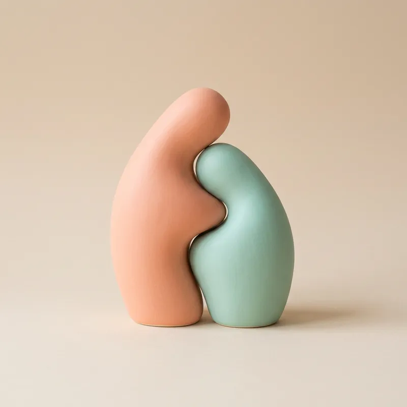 A minimalist representation of two abstract forms leaning into each other in an empathetic embrace. Shapes are very simplified, each with a single pastel color. The background is flat and of a single light color to maintain focus on the forms. The overall image subtly evokes feelings of connection and unity.