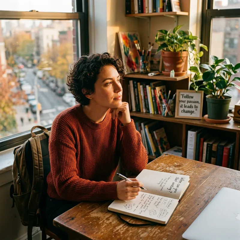 Create an image that symbolizes the concept of change and passion! Visualize a scenario of someone contemplating about the best way to answer the question, 'When can you start working?'.
