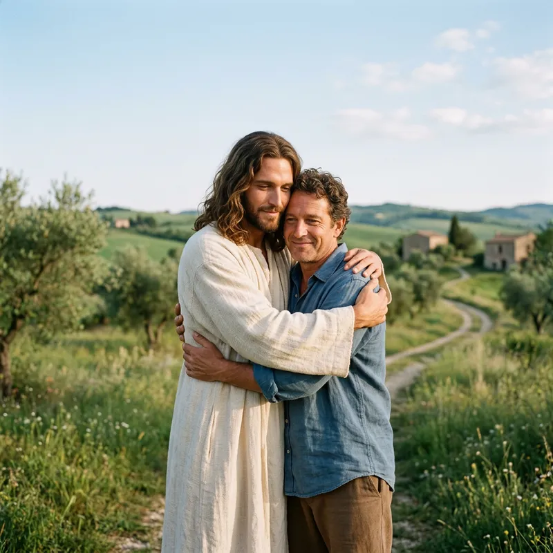 A depiction of Jesus Christ, as traditionally represented in Western art, with long flowing hair and draped in a white robe, warmly embracing a random person. The background setting is a peaceful landscape, with gentle rolling hills, green grass, and a clear, blue sky.