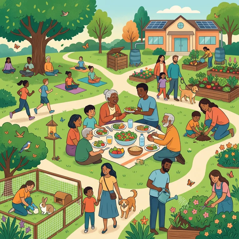 Illustrate an image demonstrating various aspects of life care. This includes a diverse group of humans, encompassing different genders, descents, and ages, showing empathy and respect towards each other. They are situated in an environment that is being well-maintained, showcasing environmental stewardship. Feature these individuals taking care of their health, engaging in fitness activities, meditating, and eating healthy food. There should also be ethical treatment of diverse animals, with animals depicted as being lovingly cared for and protected. Including scenes of nurturing and care for a variety of plants, demonstrating humans interacting with them in a gentle, caring manner. Lastly, the overall scenery radiates a sense of harmony and balance.