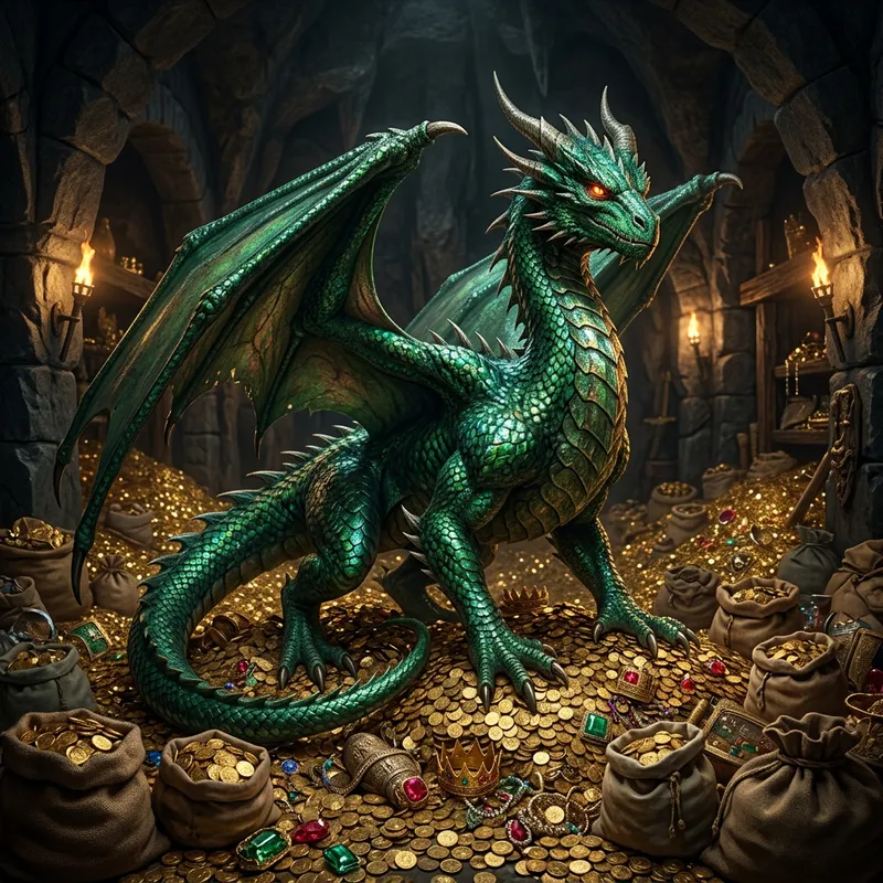 A formidable dragon with shimmering, emerald-green scales standing in a gold-laden treasury. The dragon, with its sharp claws and intricate wings, is chaperoning several sacks full of gold and assortment of riches. Its eyes, burning with a fiery intensity, maintain a stern lookout over its treasure.
