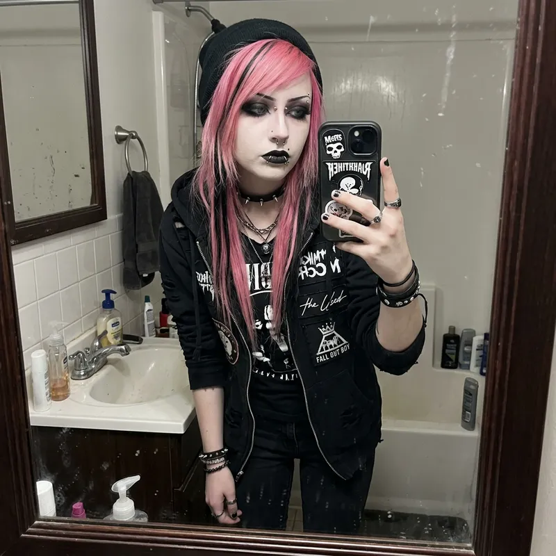 emo girl with pink hair and black strands, she has white skin and emo makeup, she is dressed in black clothes, the girl has a lot of lip, nose, and eyebrow piercings on her face and the girl takes a photo on her phone in the mirror.
