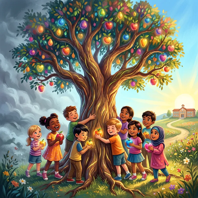 An abstract representation of emotional awareness in the field of education. Imagine a large tree with ripe fruit hanging off its branches symbolizing knowledge. At the bottom, diverse group of children of varying ages, genders, and descents such as Caucasian, Hispanic, Black, Middle-Eastern, and South Asian embrace the tree. Their faces depict a range of emotions, from joy to curiosity. Each child holds a piece of the fruit, indicative of their shared learning experience. Around them, the environment transitions from a foggy uncertainty on one side to a clear, sunny landscape on another, symbolizing enlightenment through understanding emotions.