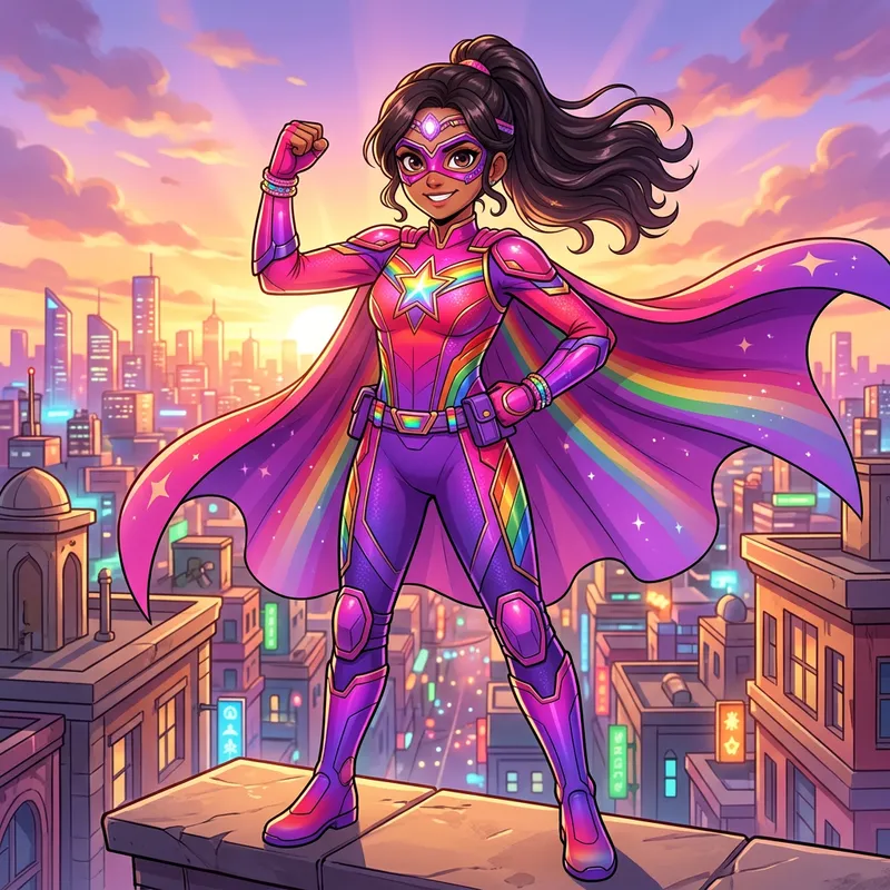 Illustration of an anime styled superhero girl of South Asian descent. She dons a vibrant full-body costume, the colors of which transition between hues of pink and purple. Her outfit should embody a sense of empowerment and pride, reflecting the colors of the rainbow. She appears youthful yet strong and determined, striking a confident superhero pose.