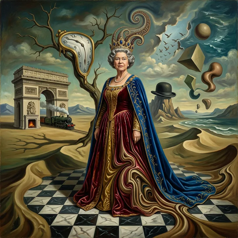 A public figure donned in regal attire standing majestically in a dreamlike, mind-bending landscape. The surroundings are filled with bizarre and disproportionate objects, reflecting the Surrealistic art movement of the early 20th century. Time warps and landscapes morph in unexpected ways around her. The glittering tiara on her head and the elaborate gown she's wearing seem to spiral into complex, curving patterns. This scene is reminiscent of the traditional oil paintings, adding a depth and richness to the image.