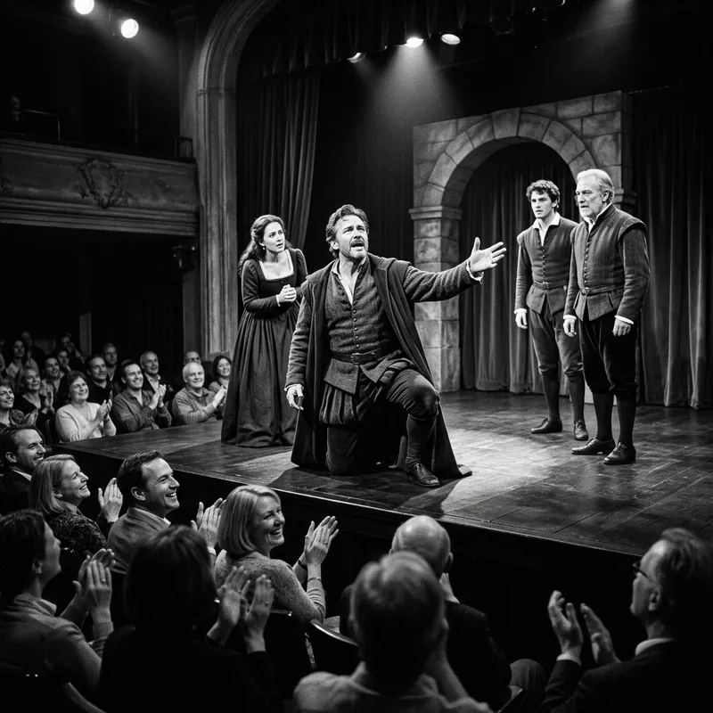 A black and white scene on a stage featuring not more than four actors, with emphasis on the principal actor. The audience should appear satisfied and content.