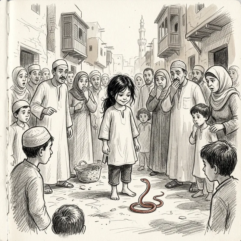 In Egypt, a small red snake dances around a 6-year-old white girl with black hair. People form a circle in the street and watch in astonishment. Pencil drawing with little color.
