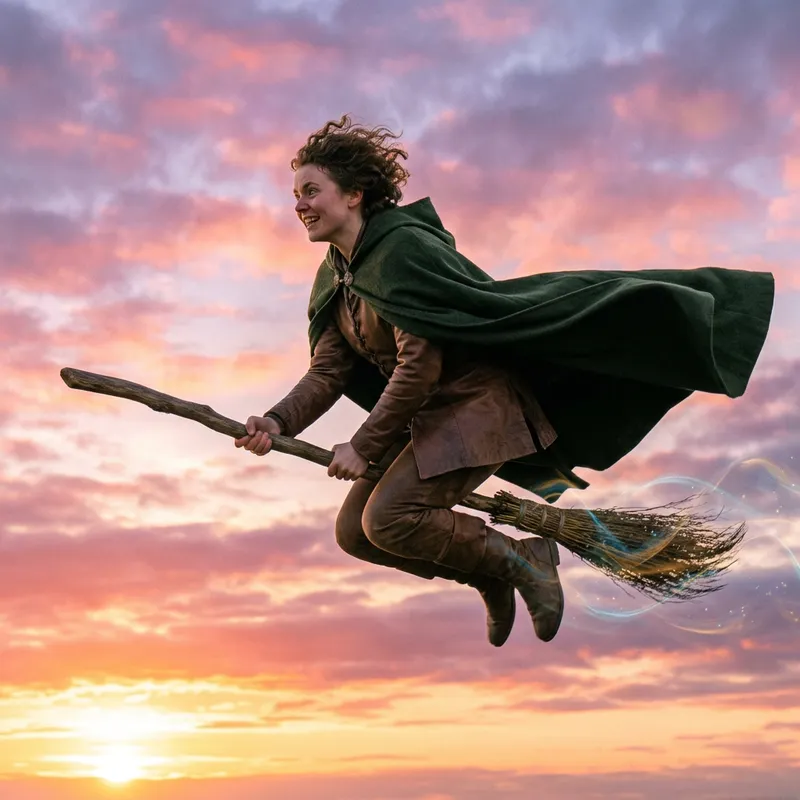 A person with an adventurous gleam in their eyes, from an uncertain descent and unspecified gender, is seen swiftly soaring through a radiant sunrise sky. The individual is balanced nimbly on an old-fashioned wooden broom, the bristles of which seem to be subtly animated, stirring in the breeze as if under an enchantment. The person wears a long, billowing cloak, their body positioned forward, conveying motion and speed. The background consists of a majestic morning sky, a riot of colors - pinks, oranges, purples, and yellows - painting the canvas of the early morning.