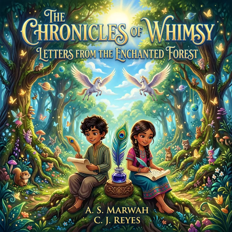 Draw a book cover featuring an enormous, mystical forest under a radiant sun. Featuring in the scene are two attractive children, a boy of Middle-Eastern descent and a girl of Hispanic descent, both engaged in writing letters. Near them are a fanciful quill and inkwell. The environment is bustling with magical creatures hopping, butterflies fluttering, and petite planets hovering about. A couple of pegasuses with their wings spread wide are also seen flying in this enchanting landscape.