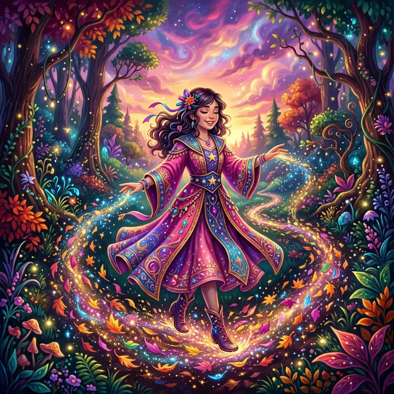 A magical girl walking through a whimsical, colorful forest. Around her, swirling leaves are magically lifted from the ground, creating a sparkling path, under a sky ablaze with hues of pink and purple. The girl, dressed in a lavishly embroidered robe with hues matching the sky, has her hands outstretched, fingertips spreading stardust as she walks along the path. She has an aura of tranquility and joy, with her radiant smile lighting up the entire scenery.