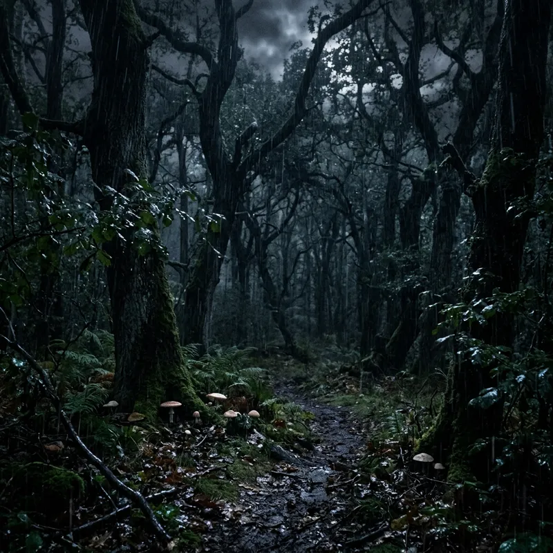 A dark, dense forest amidst a heavy downpour at nighttime. Rain droplets steadily fall creating a rhythm, glistening due to the intermittent moonlight peeking through the thick cloud cover which blankets the night sky. The occasional hooting of an owl echoes in the distance. The forest floor is a mix of wet leaves and moss, with a few toadstools dotting their way around the base of the trees. The tall, old trees forming a canopy, their shadows forming intriguing yet eerie patterns in the minimalistic light.
