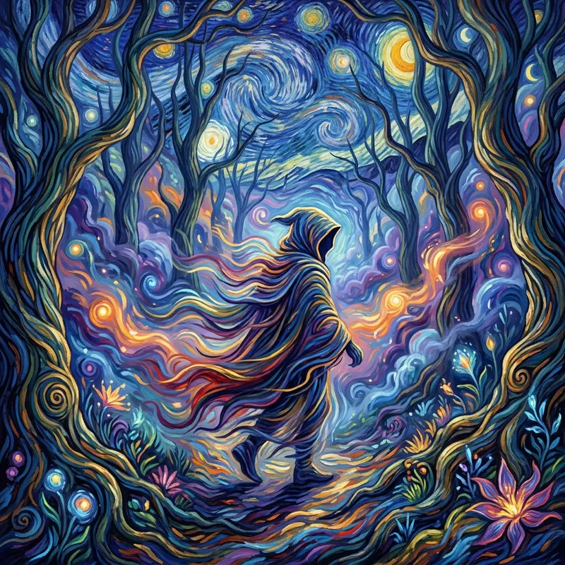 Create a mysterious figure as they journey through an atmospheric, misty forest. Use vibrant colors and swirling patterns in your representation, harnessing the expressive, exaggerated color use and brushwork found in 19th-century Post-Impressionist art, akin to the style of Starry Night by Van Gogh. Show the figure mid-stride, illustrating them with the artful tension of movement typically captured with long-exposure photography. Remember to infuse elements of fantasy throughout the composition, cultivating an air of wonder and intrigue.