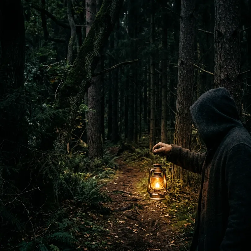 Depiction of a midnight forest scene. The trees are dense and the foliage is thick. The entire scene is shrouded in a deep, dark murkiness; the only source of light is a small yet fiercely burning lantern held by a hand of an unidentified person. The light from the lantern chases away the darkness, creating an interesting play of shadows on the surrounding trees and casting a golden glow that reaches into the hidden parts of the forest. The person's face remains unseen, focusing on the action of illumination, symbolizing courage and exploration.