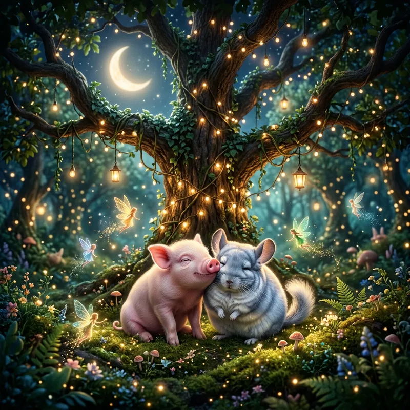 In the enchanting realm where fairy tales come to life, a chinchilla and a piglet express their endearing love for each other. They are seated together beneath the boughs of an ancient, sprawling tree adorned with lush leaves and twinkling fairylights. The piglet, with its plump, rosy complexion, is gently nuzzling the fluffy chinchilla, whose silver fur glistens under the soft moonlight. Their eyes are filled with affection, reflecting the enduring bond they share. To complete the otherworldly scene, tiny, glittering fairies flutter around them, casting a warm, magical glow on the pair.