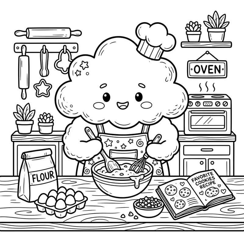 Create an enchanting high-resolution digital coloring page showcasing a whimsical cloud performing the heartwarming act of baking a beloved recipe. This should encapsulate a sense of innocence and curiosity, encouraging children to navigate their emotions and imagination. The scene must be endearing and should invoke joy and wonder in the hearts of young children. This image is intended for both online sharing and printable activities.