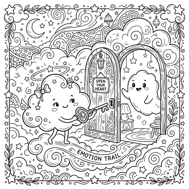 Create a high-resolution, enchanting digital coloring page featuring an illustrated whimsical cloud holding a key, poised to open a door. On the other side of the door, portray a ghostly cloud eagerly awaiting the conversation. This heartening, thought-provoking illustration captures a sense of innocence and wonder, designed to encourage children to explore their emotions and exercise their imagination. The image is crafted to be perfect for printable sheets and online sharing, aiming to bring joy to children of all ages.
