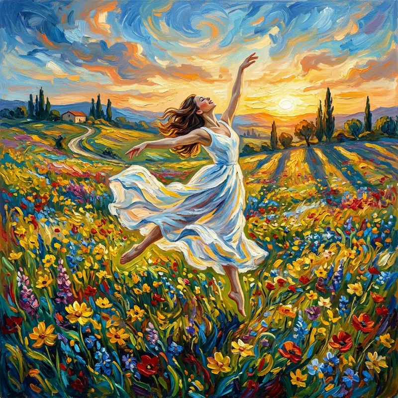 A lone Caucasian female dancer stands amidst a vast field filled with brightly colored wildflowers. She is dressed in a flowing white dress and her movements coincide with the gentle breeze touching the land. She twirls and leaps with arms outstretched, exhibiting an air of grace. Each stroke made with an impressionistic style, reminiscent of Vincent van Gogh's artwork, visualizes movement and energy, expressing joy and freedom. The warm sunlight drapes the scene beautifully, casting elongated shadows that imbue depth into the painting. This idyllic masterpiece, brought to life with a Canon EOS 5D Mark IV camera and a wide-angle lens, draws the viewer into a tranquil and happy world. The wildflowers are rendered alive, pulling in the audience into the entrancing atmosphere of this captivating dance.