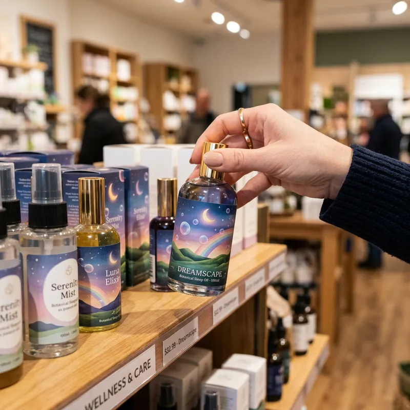 Create a detailed and realistic image of a Caucasian woman's hand gently picking up a product off a store shelf. This unique product features a design that encapsulates a dream landscape. The design visualizes rolling hills under a dusk sky, twinkling stars, and a glowing moon. Also, there are whimsical elements like floating bubbles and soft-hued rainbow-bridges, representations of a dream she once had.