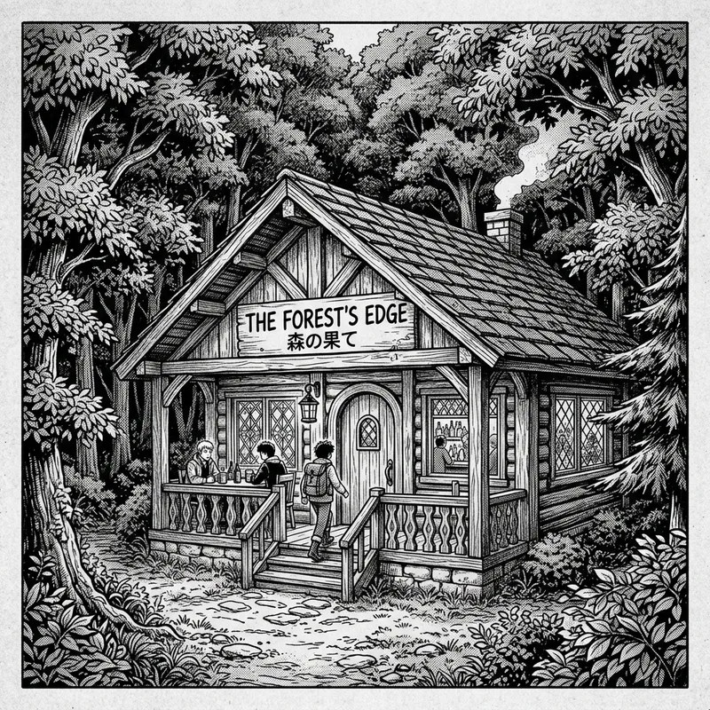 A bar nestled in the midst of a forest, depicted in the style reminiscent of 1990s vintage anime. The image should appear as if it was crafted using pen and ink, with attention to sharp line details prevalent in such comics. Aesthetically, it should imitate the black and white presentation prevalent in classic manga pieces. The bar should exhibit carefully delineated details, like the grain in the wood and the patterned glass windows. The surrounding trees should be heavy with leaves, providing the bar with a sense of privacy from the outside world.