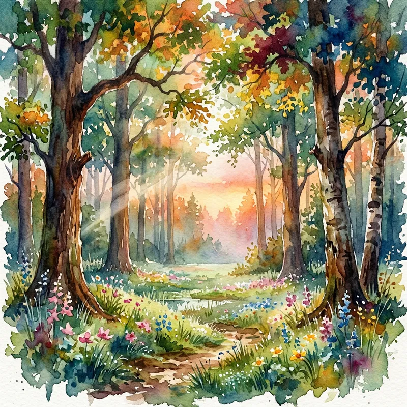 An enchanting glade in a forest set at the break of dawn, painted using vibrant watercolor strokes. Majestic trees stand tall, their dense foliage softened by the early morning light penetrating through the canopy. The scene is awash with a mystical air, inspiring peace and admiration for the beauty of nature. The rich hues of greens, browns and oranges create a vivid and dreamy atmosphere, echoing the breathtaking aesthetic of natural surroundings. The forest floor is carpeted with dew-kissed grass and sprinkled with wildflowers, contributing to the overall allure of this serene woodland spectacle.