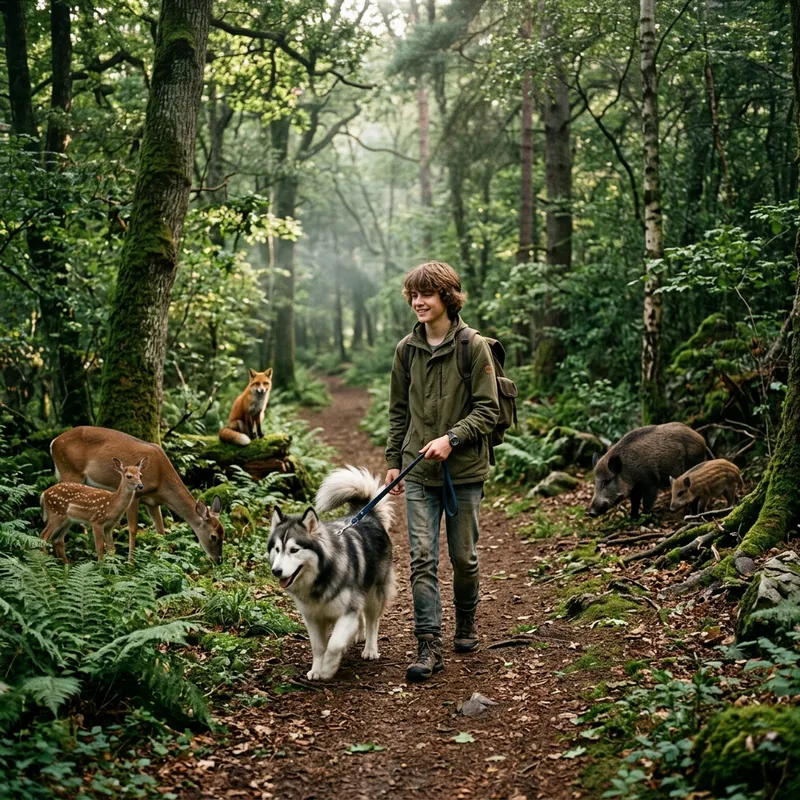 An image of a teenager walking along a mysterious forest trail with his long-haired Husky dog. Surrounding them, deer, foxes, and boars interact naturally with the wilderness environment, creating a picture of serene forest life.