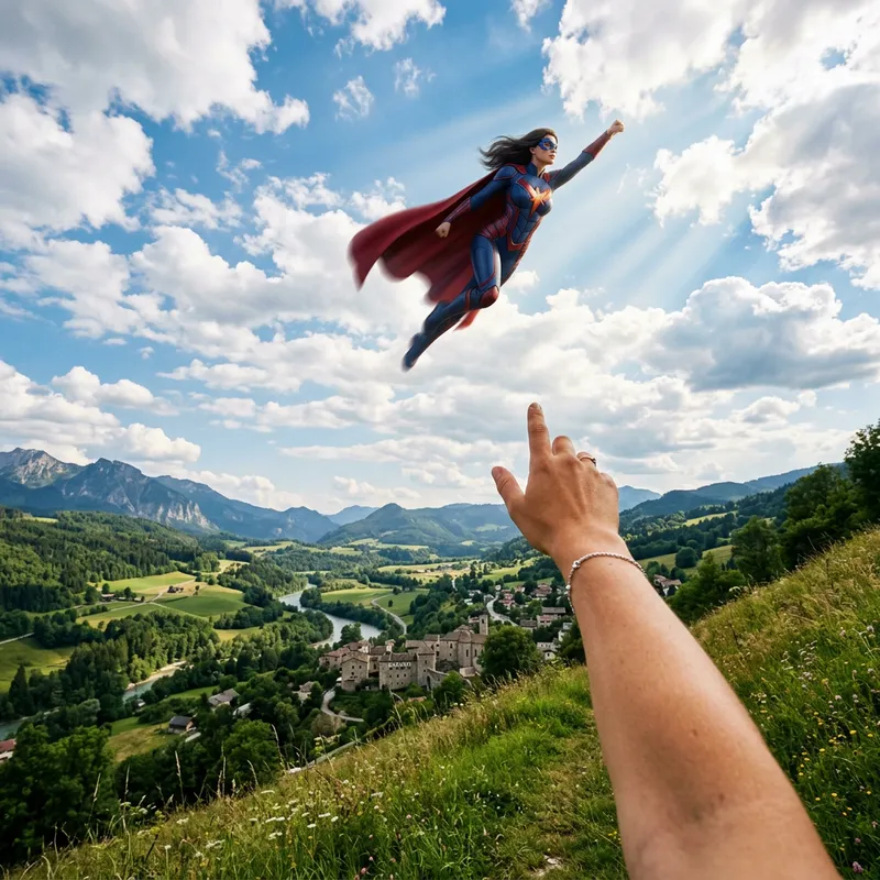 An enchanting landscape captured from your perspective. Your arm is reaching towards the blue sky with fluffy white clouds. Instead of superwoman, a fictional female superhero with a blue and red costume is soaring through the sky. The sun beams softly illuminate her as she majestically soars above the landscape.