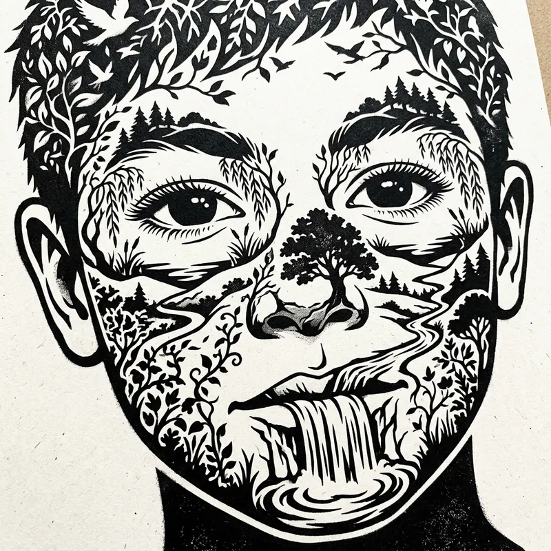 Enchanting Stencil Art: Boy's Face Transforms into Nature Scene