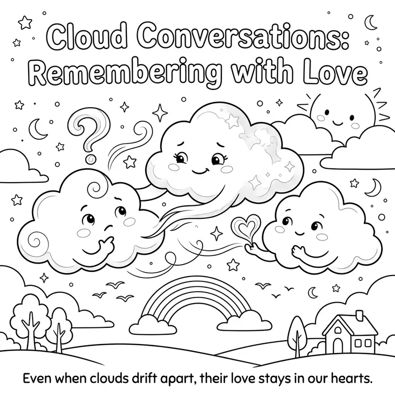 Create an enchanting coloring page for an audience of children. The scene depicts a few whimsical clouds communicating with each other about the concept of loss. Allow gentle and heartwarming emotions to permeate the image, aiming to foster a sense of innocence and wonder within its young viewers. The clouds' designs should be imaginative yet friendly, with soft curves and light shading reminiscent of a child's interpretation of such natural formations. The image will have a high resolution, making it ideal for both printing and online sharing. Most importantly, the overall design should inspire joy and spark curiosity in the young hearts who engage with it.