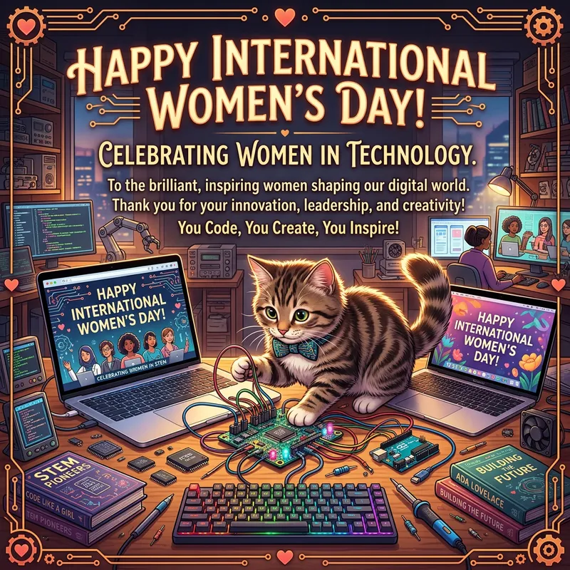 Craft an endearing greeting card celebrating International Women's Day particularly focused on women in technology. The design should be rich in detail and must feature a cute cat interacting with elements symbolic of the tech industry, like laptops, wires, or microchips. A special message celebrating the contribution of women in technology should also be prominently included. The graphics are to be ultra high-definition, giving the vibe of an 8K resolution video game environmental design.