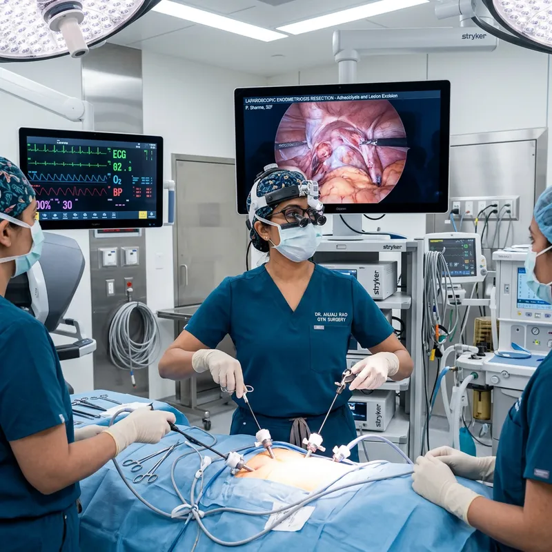Depiction of a modern, high-tech operating room where a skilled South Asian female surgeon performs a delicate and intricate operation with precision. The procedure aims to address endometriosis-associated infertility. She wears the latest fashion surgical attire while surgical tools and monitors in the room showcase a blend of cutting-edge technology and style.