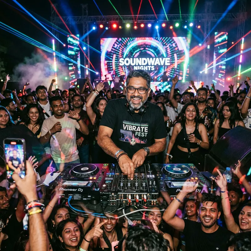 A middle-aged South Asian man performing as a DJ at a lively music event, igniting the crowd's enthusiasm with his upbeat electronic music. He is surrounded by an array of colorful LED lights, has headphones draped around his neck, and is mixing on a high-tech DJ controller. The crowd is diverse and actively engaged with people of all genders dancing energetically.