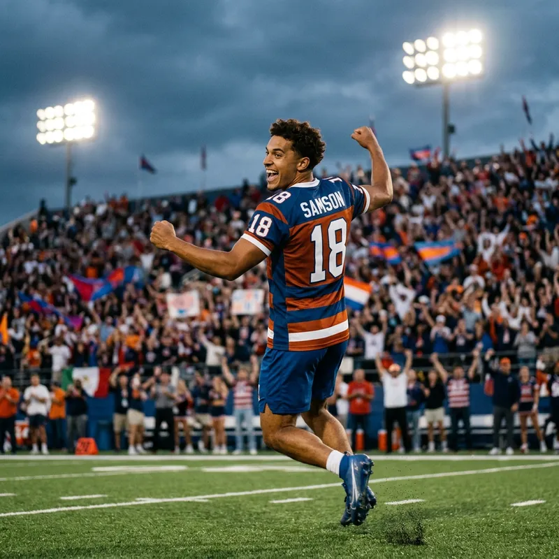 A young man in his mid-20s, of indeterminate descent, wearing a jersey number 18 of an unspecified football team with the name 'Samson' on the back of the jersey. He is in a dynamic pose that encapsulates the intensity and excitement of the sport. The backdrop captures the thrill and clamour of a typical football stadium.