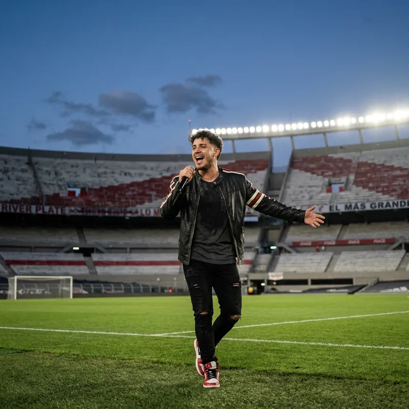 A young Hispanic male singer performing energetically on a football field belonging to a well-known Argentinian club, surrounded by empty stands