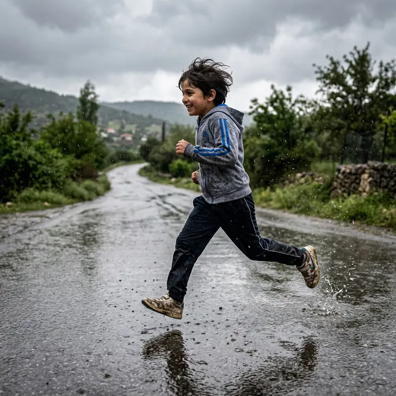 A young Middle-Eastern boy is seen sprinting down an empty asphalt road. The weather around him is overcast, with light raindrops falling upon the road's surface, creating tiny splashes with every drop. Puddles form on the ground, reflecting the dim light from the overcast sky. His hair and clothes are slightly wet from the rain, and he appears to be in motion, with his legs mid-stride and arms pumping by his side. There's a sense of urgency, and perhaps, an element of play in his determined run amidst the light downpour.