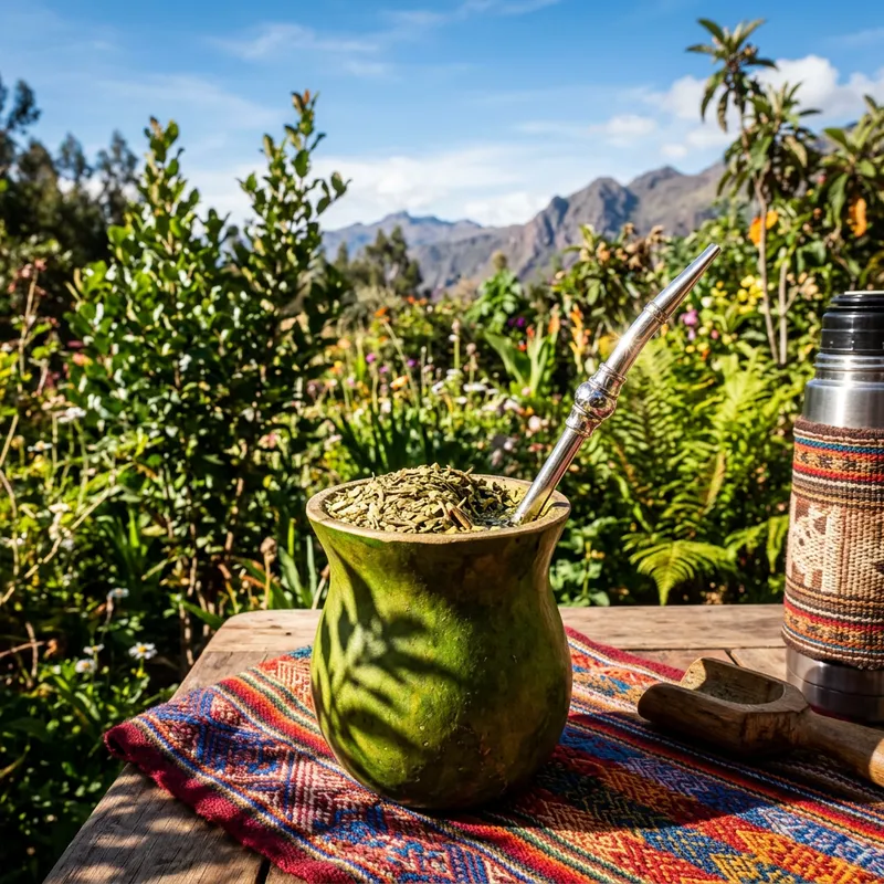 Visualize a scene encapsulating the spirit of Yerba Mate - an energising traditional South American drink. Imagine a bright green mate gourd, shimmering under the sunlight, sitting on a handwoven cloth in vibrant patterns reminiscent of the indigenous cultures. The gourd is filled to the brim with yerba leaves, their intricate silhouettes casting mind-stimulating shadows. Beside it, a silver bombilla - a metal straw - awaits to extract the tonic's nutritious essence. In the background, there are diverse plants native to the region, under the spacious sky, contributing to the sense of liveliness and vigour.