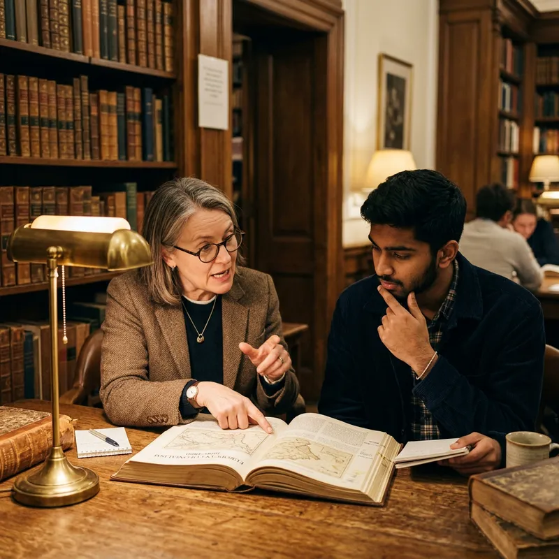 Create an image of two individuals deep in historical discourse. One is a middle-aged Caucasian woman with glasses, wearing a tweed blazer. She's passionately pointing to a thick history book laying open on a wooden table. The other is a young South Asian man, engrossed in the discussion, with his finger thoughtfully placed on his chin. They're surrounded by a cozy atmosphere of a traditional library, lined with old books and illuminated by a warm, soft glow of a desk lamp.